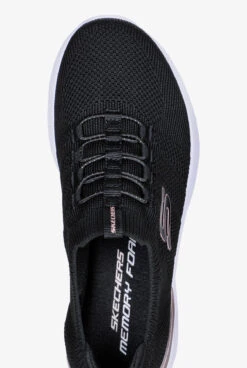 Skechers Sport Arch Fit Comfy Wave Black/ Lavender Athletic Lace Up Shoes feel great from top to bottom. Classic lace-up style in breathable mesh. Patented Arch Fit® memory insole with podiatrist-certified arch support. Cushiony midsole, flexible rubber outsole. In black with lavender and aqua accents.