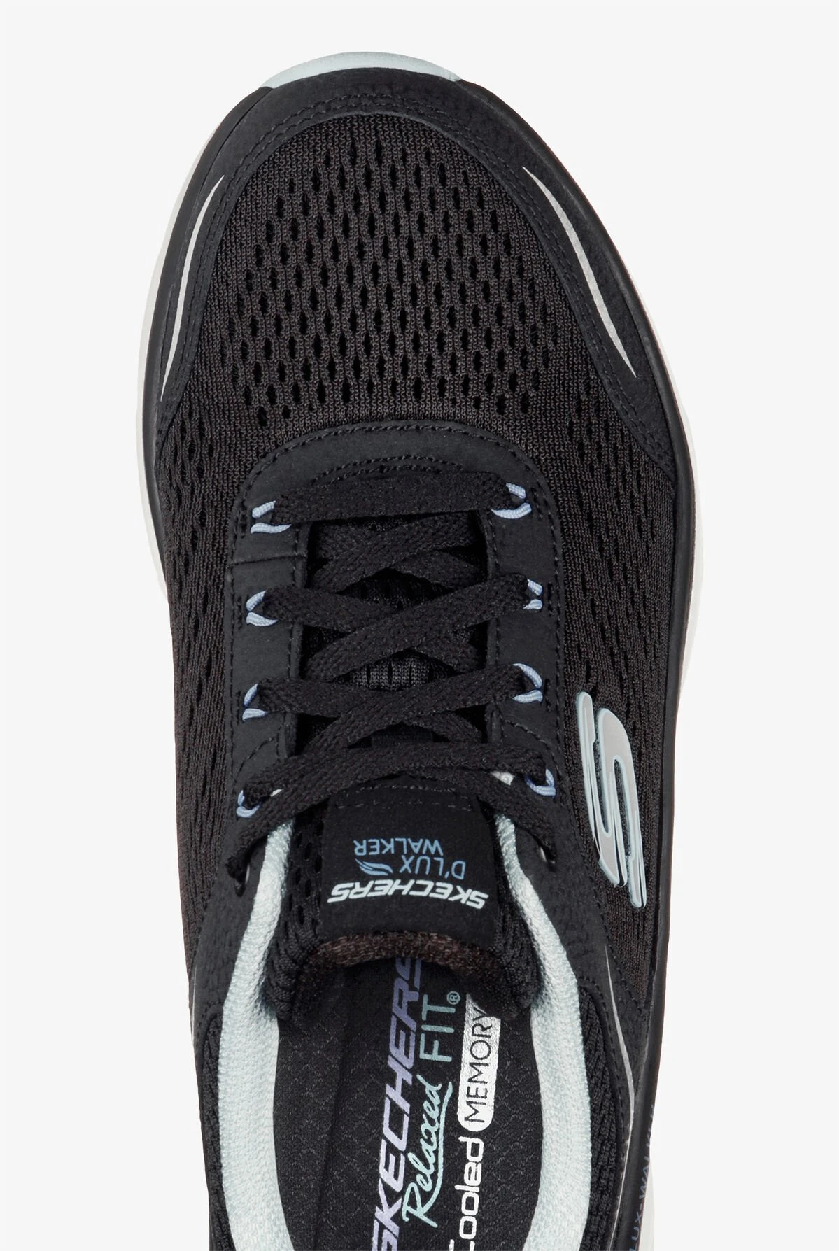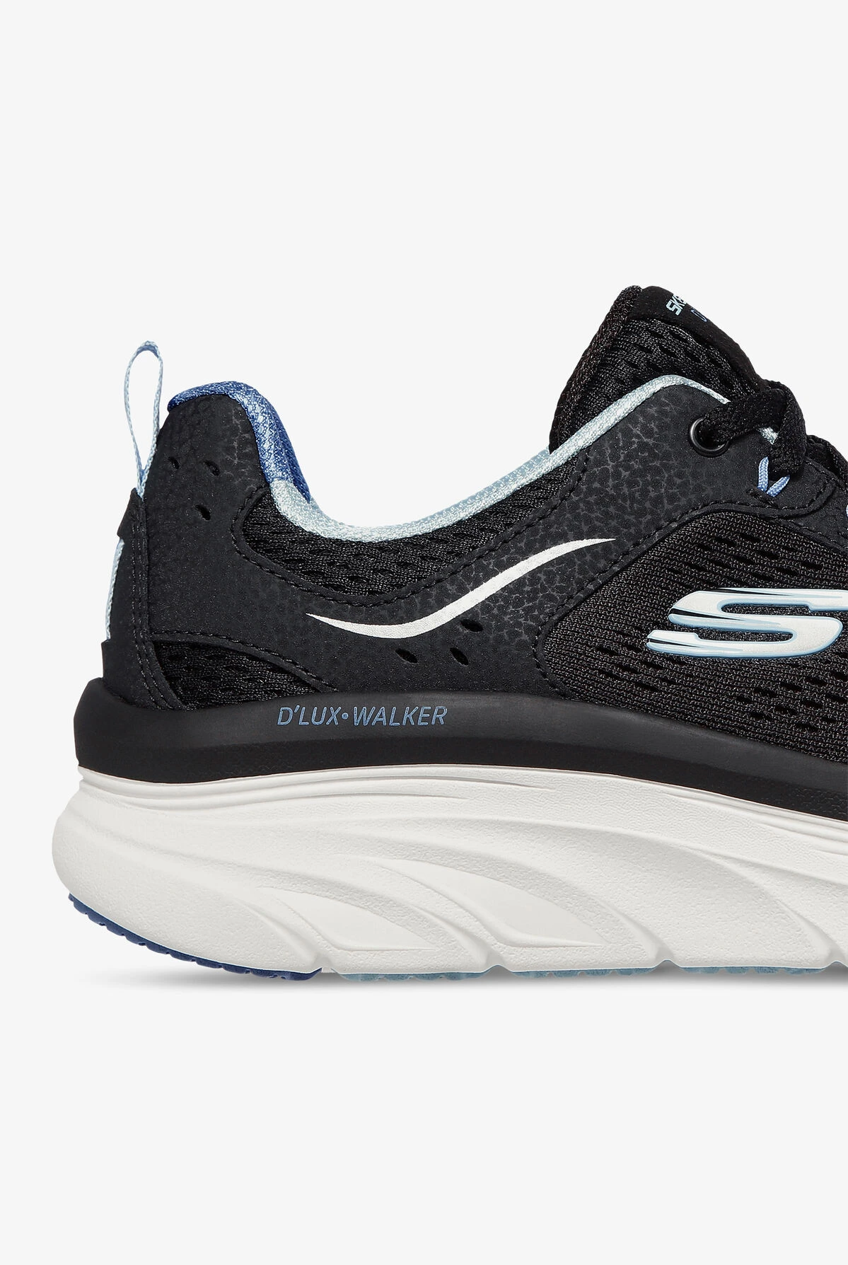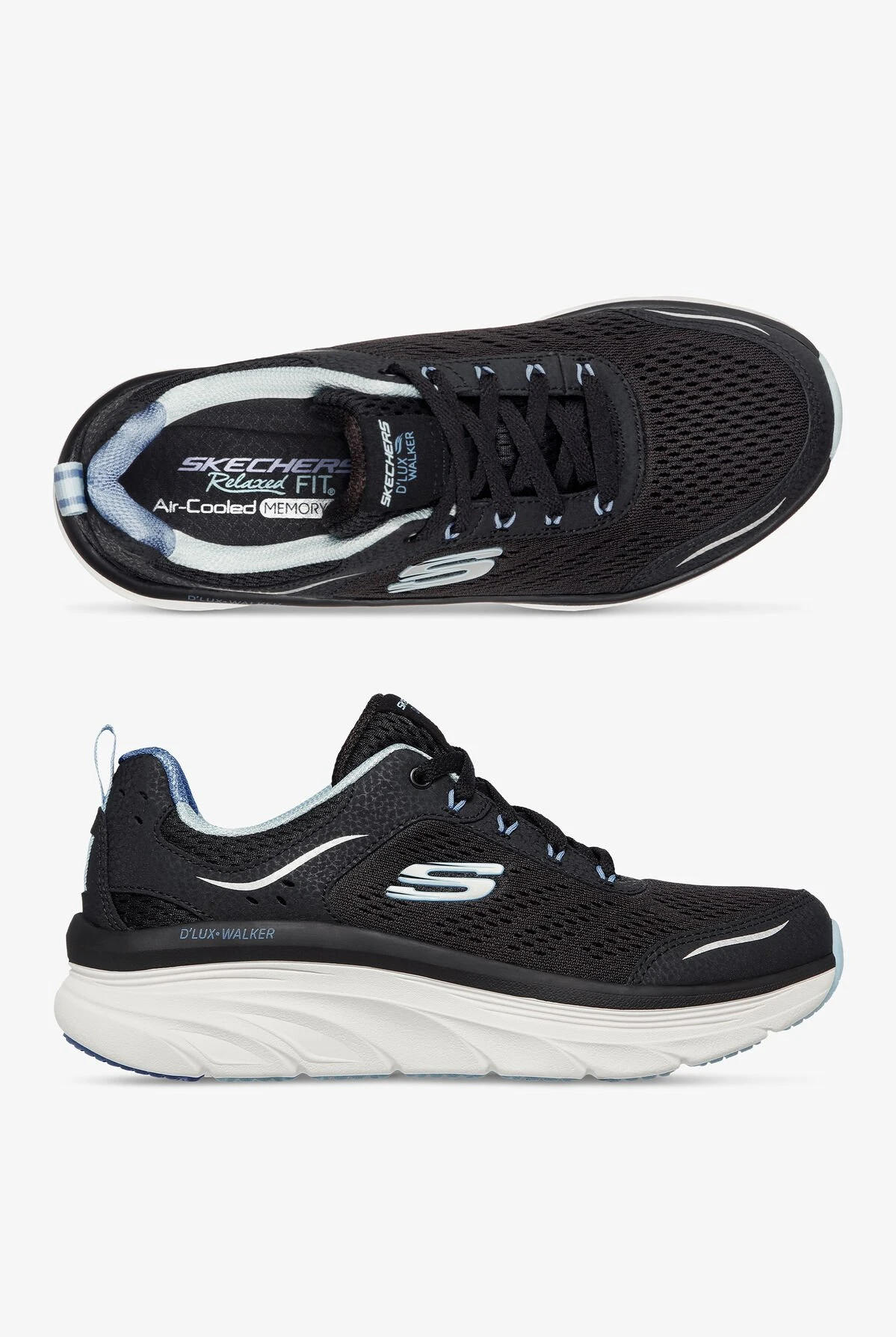 Skechers Sport Women’s D’Lux Walker Infinite Motion Black Athletic Lace Up Nursing Shoes feel great from top to bottom. Classic lace-up style in Relaxed Fit® for roomier feel and Skech-Foam cushioned midsole for a smooth stride. Flexible rubber traction outsole. Machine washable.