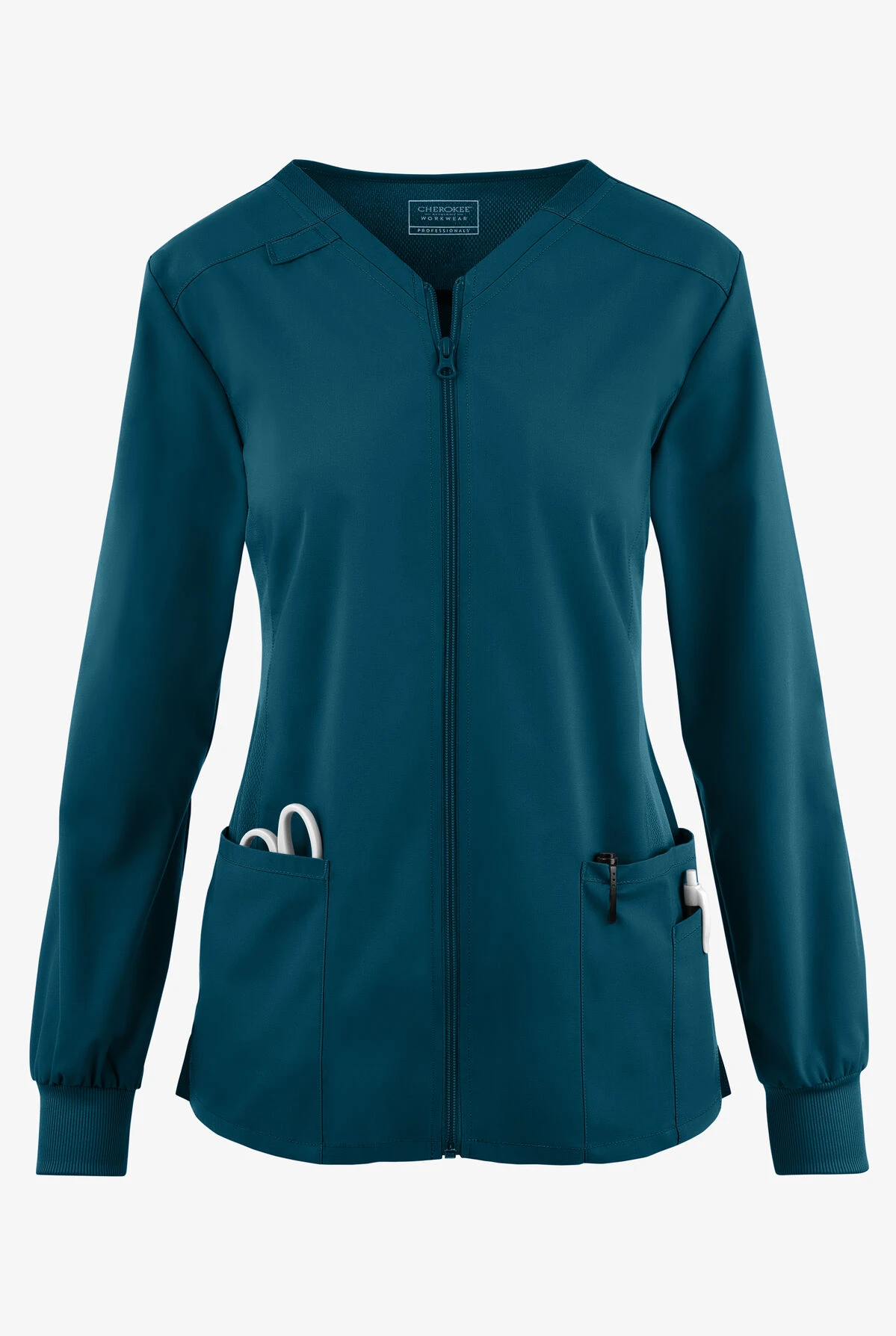 Effortless fashion for hardworking professionals. Our exclusive Cherokee Workwear Professionals Active Scrub Jacket blends flattering and functional details with a touch of spandex. Each classic design in the Cherokee Workwear Professionals collection is built for flexibility, fit for mobility, and offers a modern, clean look in a 2-way stretch poplin fabric.